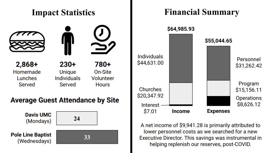 More than 150 unique individuals were served more than 2720 lunches during 2024. The average number of guests per day at United Methodist Church was 22. The average number at Pole Line Baptist Church was 30. Lunch provider volunteers represented six churches, along with lunches provided by Patti Miller. There were usually three or more volunteers at each site for 2½ hours each day. At least 780 volunteer hours were donated at the sites but many more hours were given through volunteers preparing lunches, leading Bible study, serving Communion, visiting churches and the Farmer’s Market, making bike repairs, and various other activities.